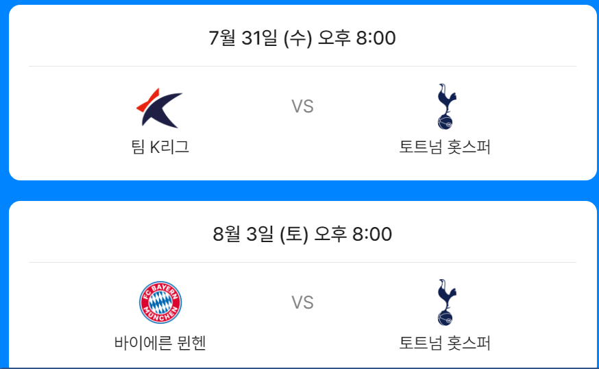 첫 번째 매치는 팀 K리그와 토트넘 홋스퍼의 경기로 7월 31일 수요일 오후 8시에 펼쳐지게 됩니다.