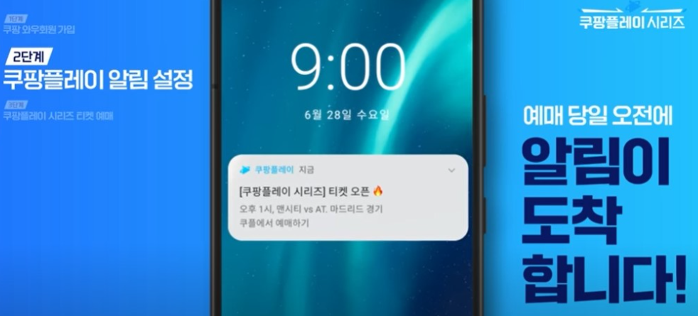 쿠팡플레이 앱에 들어가시면 티켓 예매 오픈 알람 받기 기능을 설정하실 수 있습니다. 티켓 예매를 성공하기 위해 꼭 설정해 놓으세요.