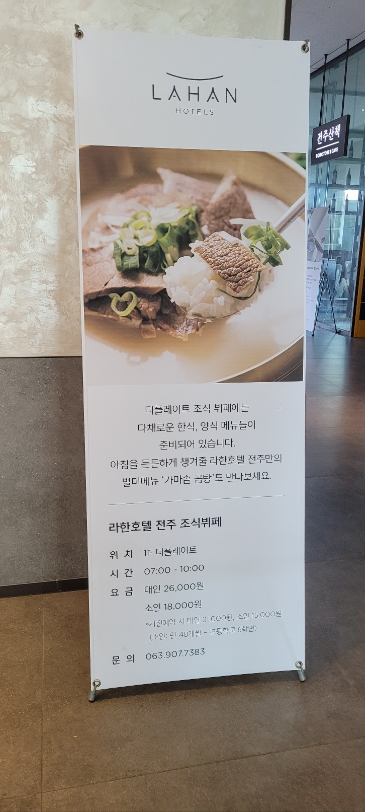 라한호텔 조식은 1층에 위치한 the plate에서 가능합니다. 시간은 아침 7시부터 10시까지 이용 가능하고 성인 26,000원, 소인 18,000원입니다.