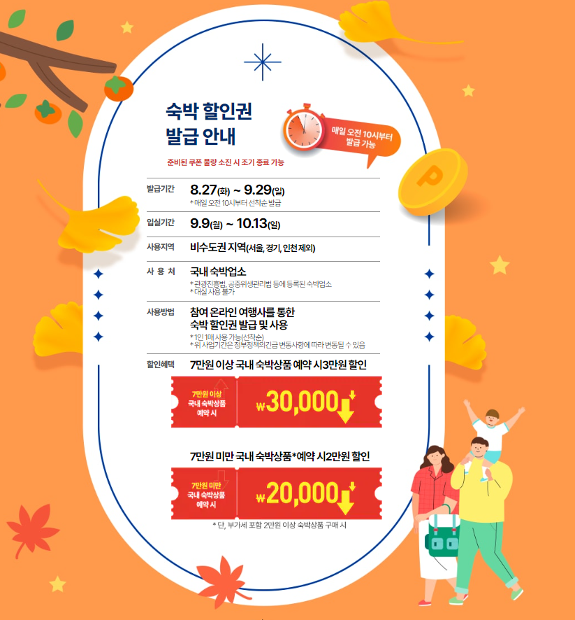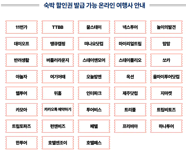 7만 원 이상 숙박상품 예약 때에는 3만 원 할인권, 2만 원 이상 7만 원 미만 숙박상품 예약 때에는 2만 원 할인권을 지원합니다. 할인을 적용하는 시설은 호텔, 콘도, 리조트, 펜션 등 국내 숙박시설이며 미등록 숙박시설과 대실에는 사용할 수 없습니다.