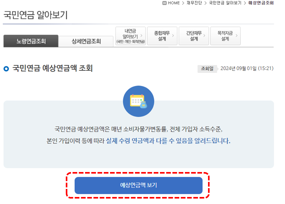 3. 왼쪽의 국민연금 예상연금액 알아보기를 클릭합니다.