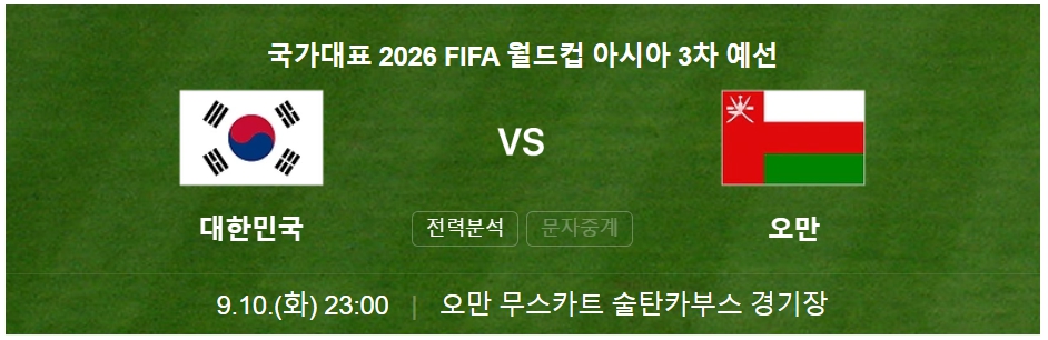 홍명보 감독이 이끄는 대한민국 축구 국가대표팀이 2026 FIFA 월드컵 아시아 3차 예선 두 번째 경기로 오만과 맞대결을 펼칩니다. 이번 경기는 한국이 월드컵 본선 진출을 위한 무조건 승리를 해야 하지만 중동의 원정이 쉽지 않아 보입니다. 부담을 갖고 두 번째 경기를 펼치게 될 우리 선수들에게 따듯 응원이 필요해 보입니다.
