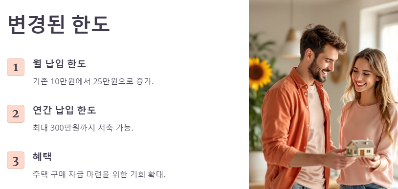 월 25만원으로, 연간 최대 300만 원까지 납입이 가능합니다. 이는 청약통장에 더 많은 금액을 저축할 수 있게 해 주어, 주택 구매를 위한 자금을 보다 빠르게 마련할 수 있도록 도와줍니다. 특히, 무주택자 부부가 함께 저축할 경우, 더 큰 금액을 저축할 수 있어 주택 구매에 대한 부담이 줄어들 것으로 기대됩니다.
