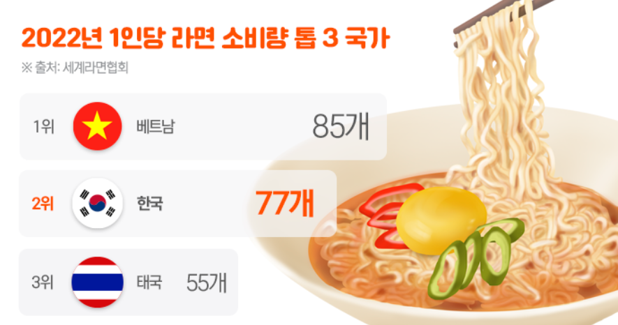 한국은 베트남에 이어 2위를 차지했습니다. 한국인들이 한 해 동안 먹은 라면의 개수는 77개입니다. 4.8일에 한 번은 라면을 먹었다고 볼 수 있지요.