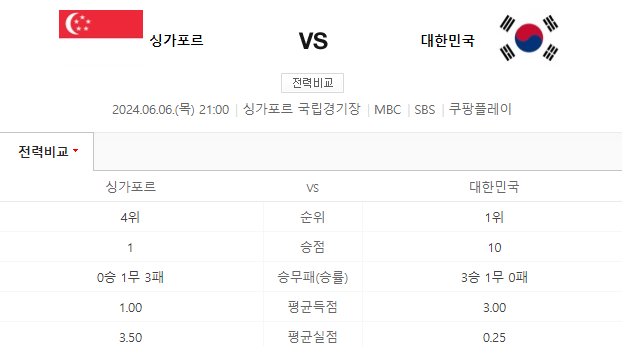 | 2024. 6. 6. | 싱가포르 vs 대한민국 | MBC, SBS, 쿠팡플레이 |
