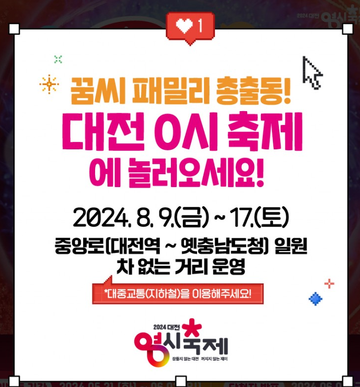 24년 8월 9일부터 8월 17일까지 진행되는 이번 축제는 대전 중앙로 일원(대전역~옛 충남도청) 에서 차 없는 거리로 운영이 될 예정입니다.