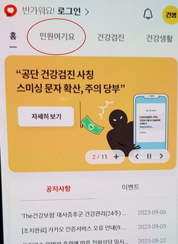 - The건강보험 어플로 접속 후 공인인증서 로그인 > 민원 여기요 > 메뉴에서 개인민원을 클릭합니다.
