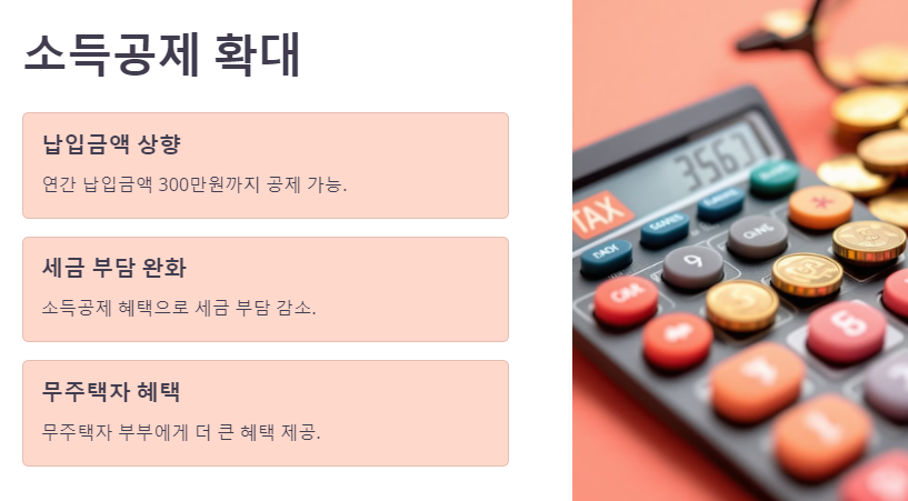 이번 납입 인정액 변경과 함께 소득공제도 확대되었습니다. 연간 납입금액이 300만원으로 상향됨에 따라, 소득공제 혜택도 증가하게 됩니다. 이는 주택청약종합저축을 통해 저축을 하는 분들에게 세금 부담을 줄여주는 긍정적인 효과를 가져올 것입니다. 특히, 무주택자 부부가 함께 저축할 경우, 소득공제를 통해 더 많은 혜택을 누릴 수 있습니다.