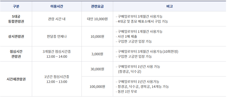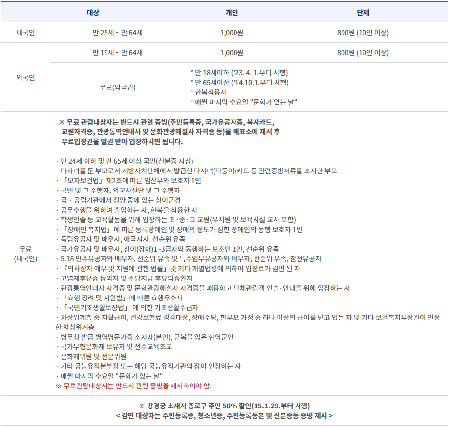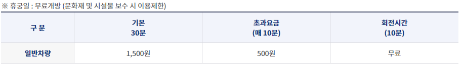 ※ 휴궁일인 공휴일과 겹칠 경우 개방하며, 개방한 공휴일 다음의 첫 번째 비공휴일을 휴궁일로 합니다.